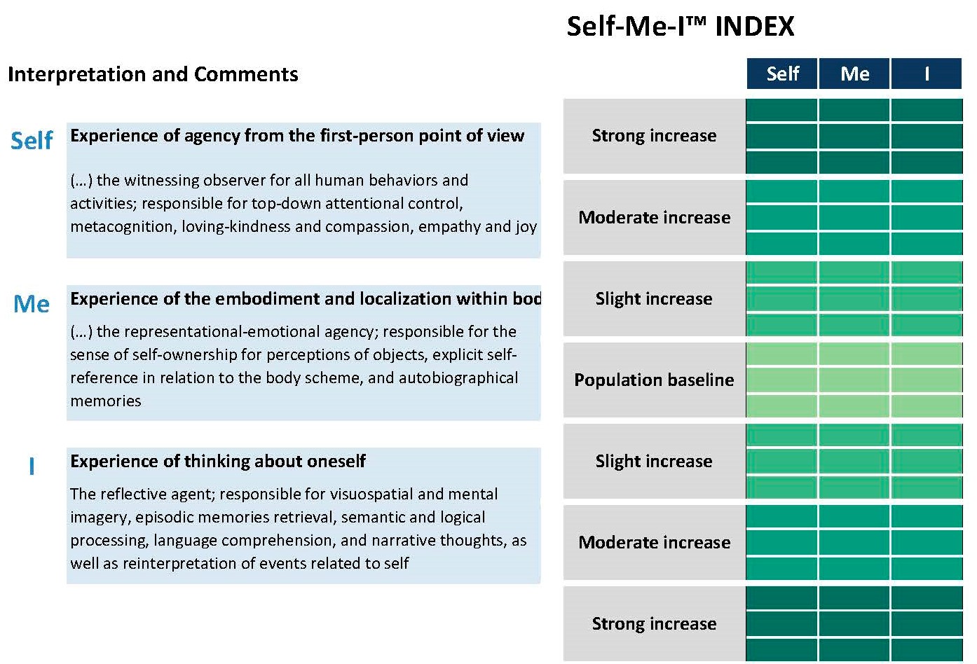 - Self-Me-I index captures changes in the experience of the self through meditation.