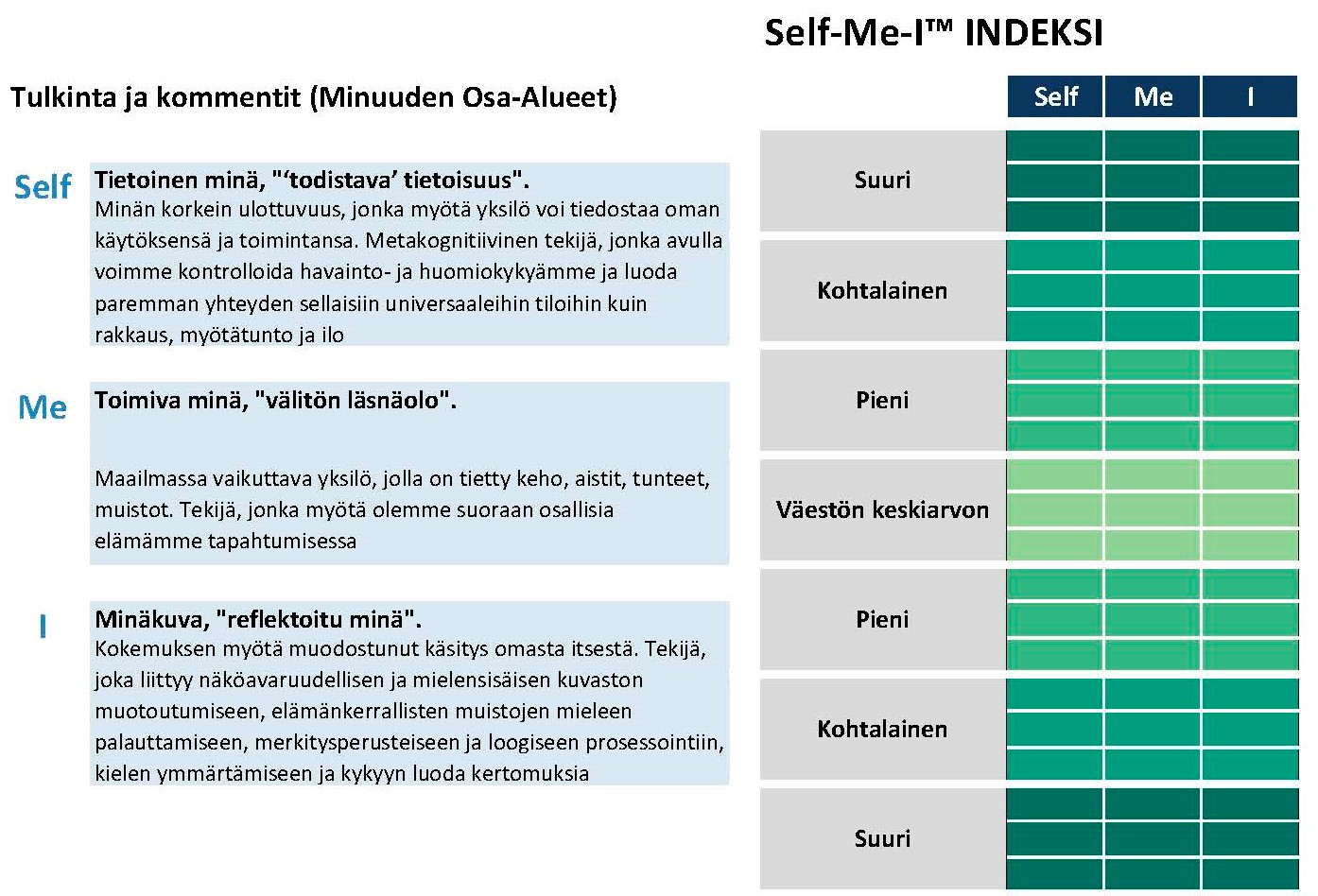 - Self-Me-I Indeksi tavoittaa minuuden kokemuksessa meditaation myötä havaittavia muutoksia.